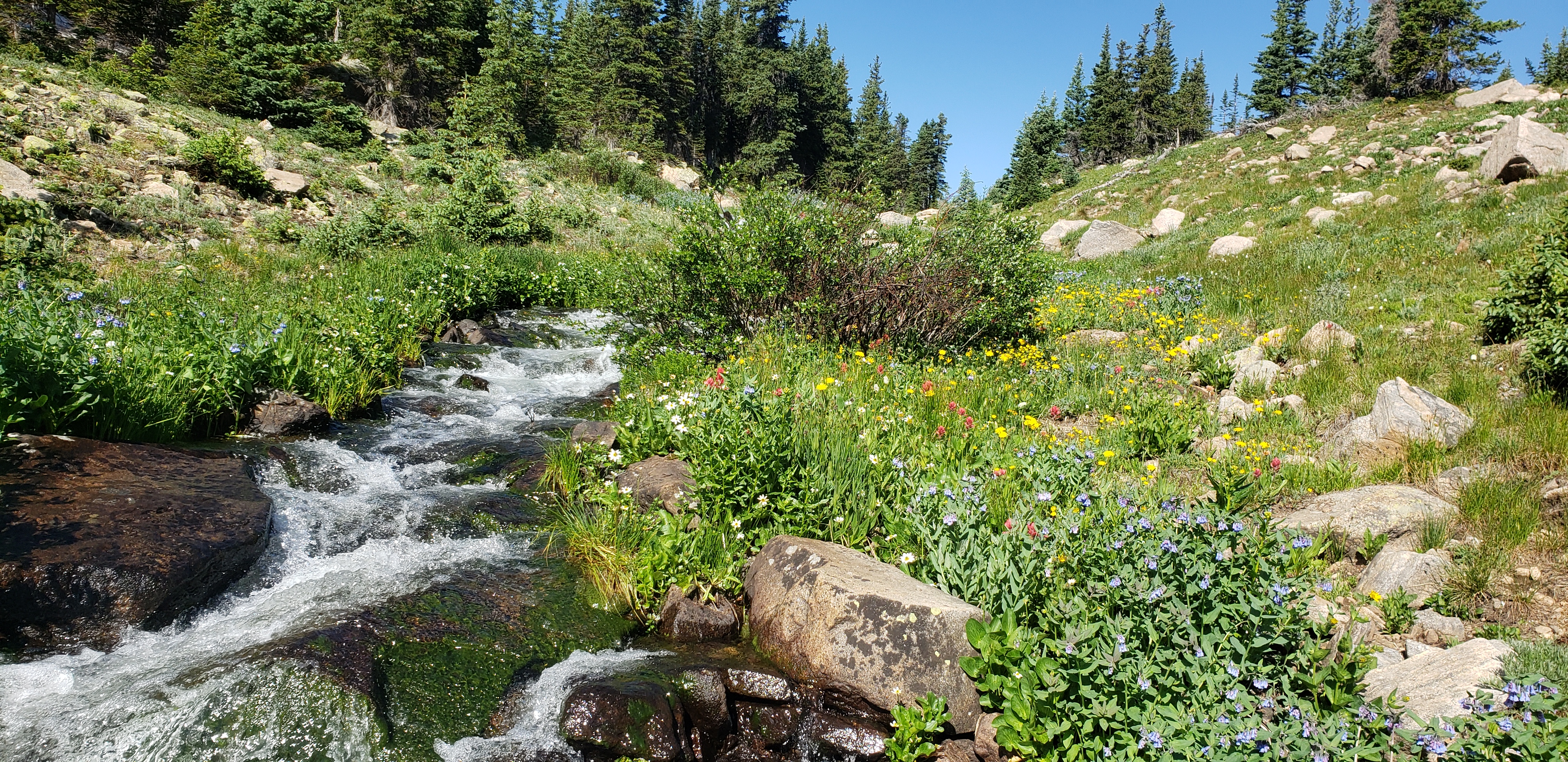 Near treeline, the outflow stream and wildflowers lead the way to Woodland Lake and the headwall where Skyscraper Reservoir sits. Camp in one of the many great campsites around Woodland Lake, they are easy to spot and afford a variety of vantage points in the basin. The stream coming into the lake from above makes for a great location to scout out a campsite and will provide a great source of water. Always filter or treat drinking water.